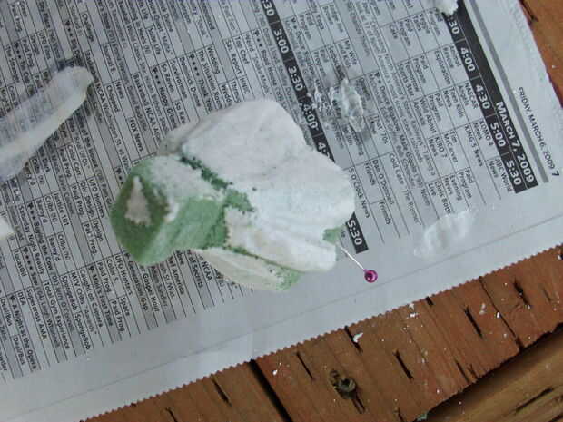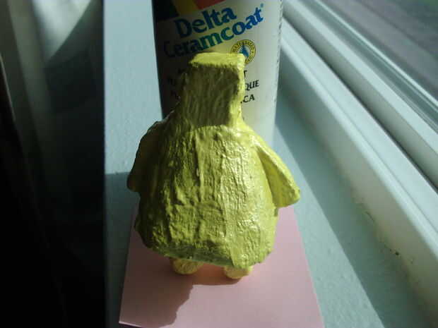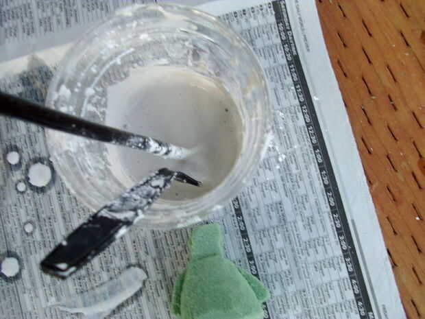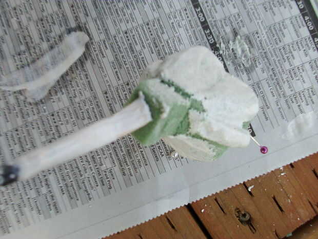 Así que mezclar algunos escayola con agua por lo que es justo lo suficientemente gruesa como para pintar con un pincel. Si desea cubrir el verde totalmente probablemente tendrás que pasar un par de veces. También, para sus cosas de la oreja roja puede poner un yeso más grueso en los lados de su cabeza.