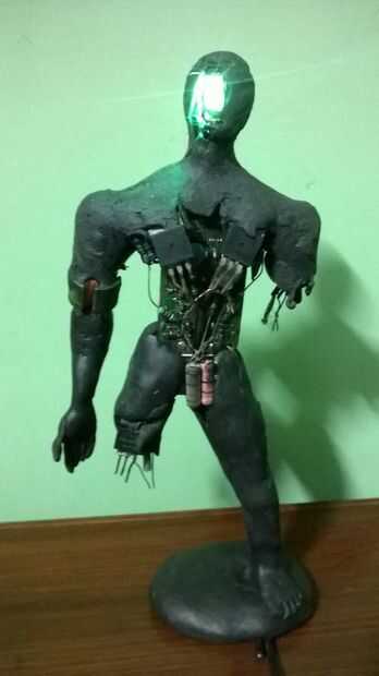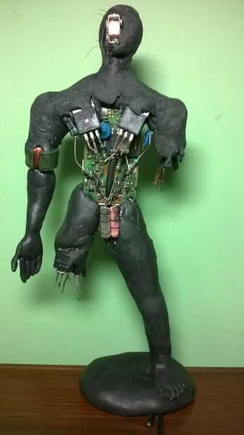 Hecho principalmente de una cola a base de resina, la T-2000 es agua/fuego/casi nada resistente. Componentes principales son un dongle wi-fi roto, transistores, resistencias, condensadores, diodos, un eje motor, alambres de hierro y un LED.