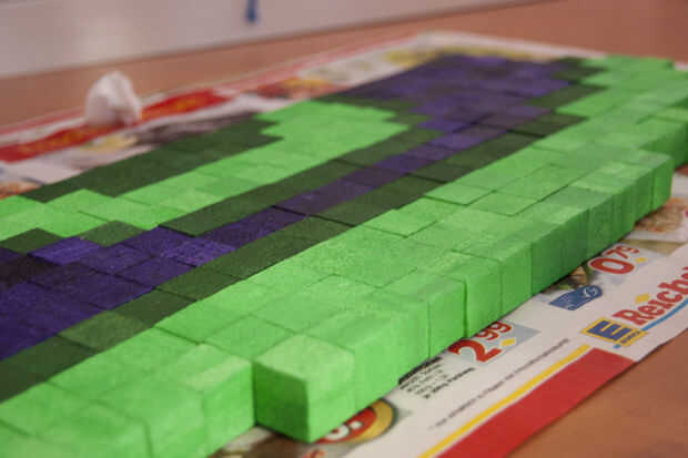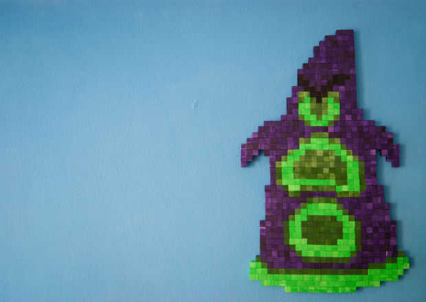 1. tomamos una imagen de alguna pc vieja escuela juego. Nos encantó DOTT; Tuvimos claro a poner morado en la pared muy pronto. Tomé la imagen y procesado en photoshop con menos pixeles y una cantidad limitada de colores. (llevamos 4 colores: morado (obviamente ^^), verde oscuro, verde claro y negro) Basado en esta imagen hemos hecho un plan de acción.