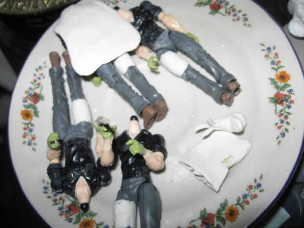 Esta vez tenía un plan mucho más fácil. Compré 6 cifras "Rata de túnel" y mantuvo los cuerpos en su mayoría intactos. Hice algunas pequeñas alteraciones, como quitar la funda del cuchillo en la pierna de cada figura. Tomé las cabezas de las figuras y de tierra de la cara y el pelo de cada uno. Inicialmente trató de hacer individuales cabeza esculpe, pero renunció a esa idea cuando ellos todavía no ven bien. Entonces hice una agradable mirar rostro genérico para cada figura. Quería que esta cara a la última sin arruinarlo accidentalmente, por lo que tenía que conseguirlo de alguna manera en su lugar. Para establecer la arcilla de modelado sin hornearla (y derretir el plástico) utilicé el Truco de hervir. De este modo la arcilla establece sobre todo y las piezas originales permanecen igual.