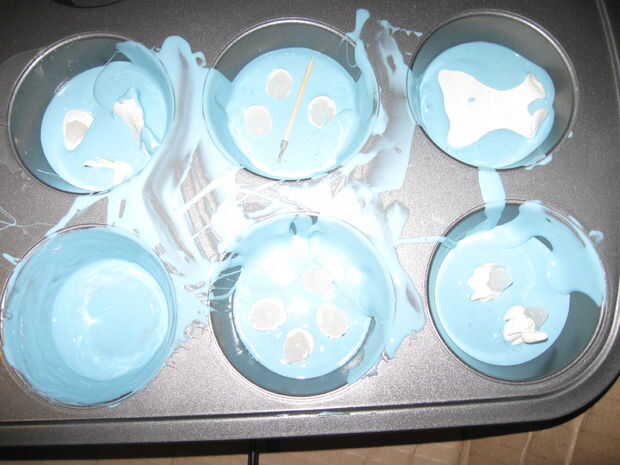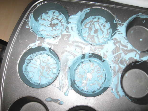 Después de esculpir un par de accesorios y todo el pelo había sido agregado a las cabezas de cera, hice unos moldes pequeños. Usé una bandeja de muffins para mantener los moldes pequeños y fácil. Así. que no tengo que hacer varias cajas pequeñas para verter el caucho. Lamentablemente la mezcla de goma de silicona se adhiere aparentemente a utensilios antiadherentes, pero era capaz de quitar los moldes de bollitos con un daño mínimo a los moldes. He probado los nuevos moldes con cera y nada se filtró estaba listo para el plástico.