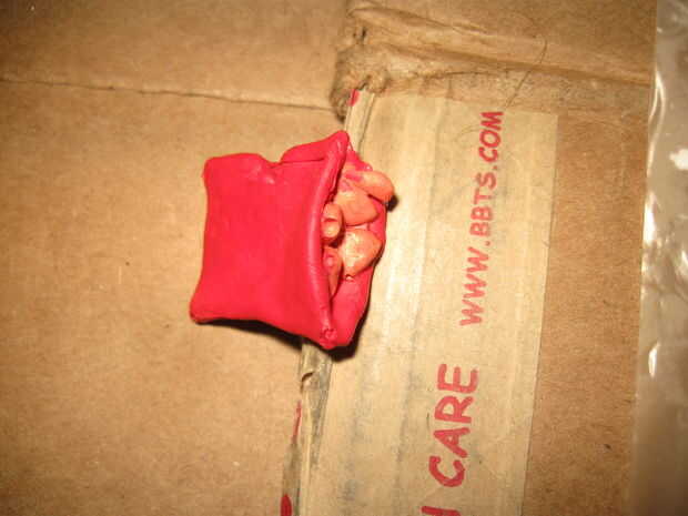 Como los accesorios, pinté las cabezas alternas al mismo tiempo que pinté la cabeza regular. He pintado todos los accesorios como debe ser coloreados. (Por ejemplo, con el pato muerto pinté la cuenta amarilla, mangled cuello rojo y negro Xs donde estarían los ojos.) El único que tiene complicado fue el bistec de cabeza para mi figura. Hice un a color rojo. Antes de que estuviera completamente seca, utilicé un palillo de dientes para dibujar un poco de pintura blanca para formar el patrón de mármol. Entonces revolvió las líneas de arriba un poco para mezclar mejor. Después de que fue hecho, usé la misma técnica para añadir un poco de rojo nuevamente dentro de las piezas de carne.