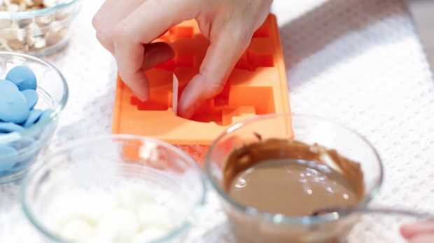 Primero lo que tienes que hacer es agarrar un pedazo de papel pergamino y cortar una pequeña plaza que descansan en su molde y separar el cuerpo de la cabeza. Luego se funde el primer color de chocolate que vas a usar para el cuerpo. Elegí el chocolate con leche. Se puede derretir en el microondas (ráfagas de 30 segundos, remover, 30 segundos, remover, 10 segundos), o usted puede fundir en la estufa usando el método del baño María, que esencialmente descansa un recipiente en una olla con agua y el vapor de agua hirviendo el recipiente se calienta y derrite el chocolate. Usted quiere tener cuidado y no quemar el chocolate.