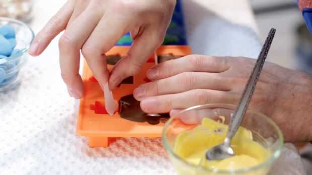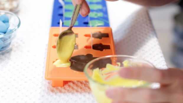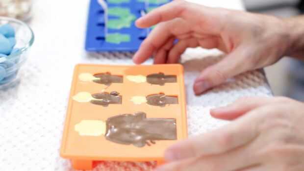 Ahora después el cuerpo, nos quieren quitar todo el papel de pergamino (sea suave y no se olvide de ahorrar papel para moldes más). Luego derretir nuestro color de chocolate que queramos nuestra cabeza que y luego vierta. Dar el molde un poco batido y poner de nuevo en la nevera por 20 a 30 minutos.