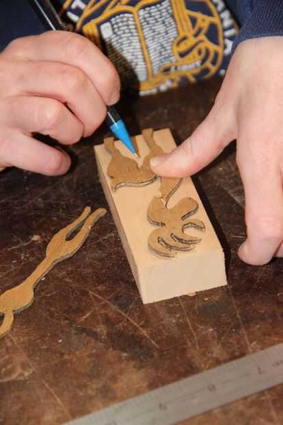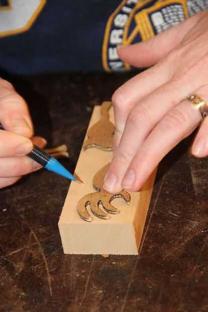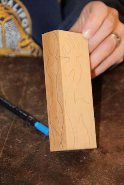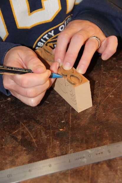 El perfil frontal va en el lado estrecho del bloque. Perfil frontal y lateral línea correctamente entre sí, véase la foto marca el reno en la línea de asta de ciervo (se muestra en la plantilla). En el perfil delantero Asegúrese de dejar suficiente espacio entre el Reno y el borde de un bloque de madera; cada pieza de basura lateral debe salir en una sola pieza, consulte el siguiente paso.