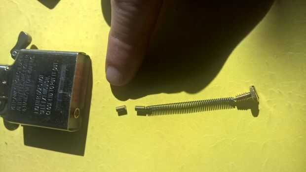 Tire el tornillo completamente del encendedor. Una vez fuera debe haber un pequeño objeto cilíndrico que está separado del tornillo (como se indica con el dedo en la segunda foto). Este es el pedernal.