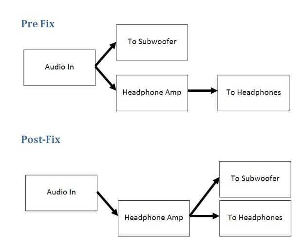 La solución teórica (Recuerde que esto es sólo una teoría, nada es confirmado) sería añadir un preamplificador. O el caso más fácil, para volver a utilizar el preamplificador de auriculares como un tampón, así eliminando la necesidad de piezas adicionales.