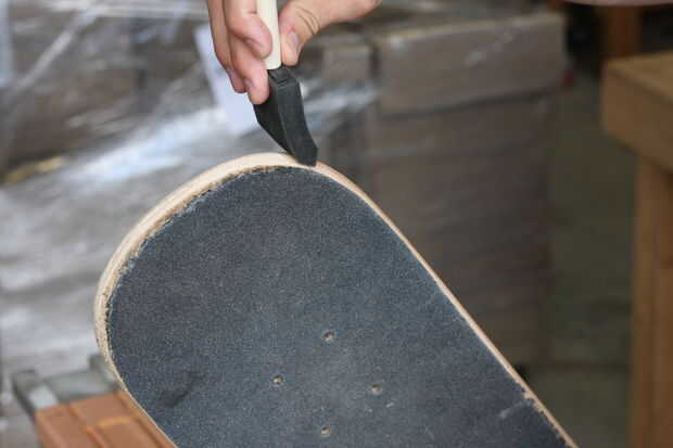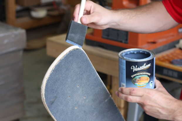 Una vez que el área ha sido lijado y limpia de cualquier pegamento o suciedad, se puede aplicar su capa protectora al borde expuesto de su monopatín. Puede utilizar cualquier acabado como está clasificada para uso al aire libre y tiene propiedades impermeables. Siga las instrucciones en la lata y después de unas cuantas capas debe ser bueno para ir!