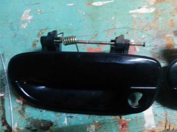 La manija de la puerta de entrada es la primera imagen y si se compara a la segunda, se puede ver que la parte que se conecta a la barra de apertura (la pieza amarilla) se interrumpe en el mango delantero y no en la parte posterior. Por lo que ahora es el momento de la switchamaroo viejo!