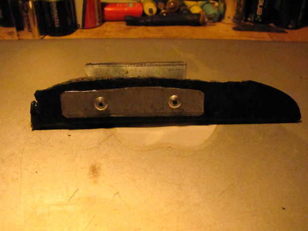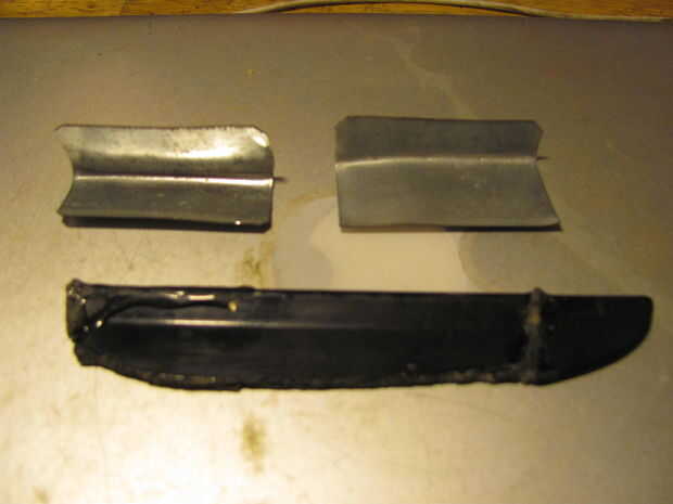 El roto pedazo es frágil y podrido. Remachado hizo romper en trozos más pequeños. Tomé 2 pedazos de lata chapa galvanizada techo y estaba doblados doblado una pieza para subir detrás de la parte trasera intacta de la manija de la puerta y una segunda pieza de metal para sostener la pieza delantera podrida. JB Weld fue utilizado para unir las partes de la pieza frontal y las dos piezas de metal fueron remachadas juntos.