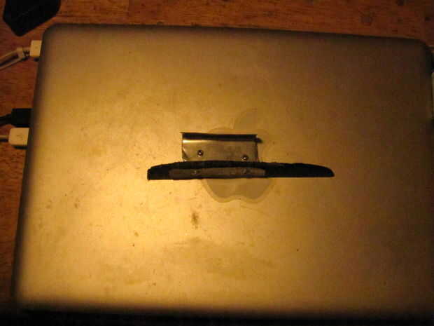El parche montado recogido en la parte posterior de la manija de la puerta y mantiene en su lugar con JB Weld.