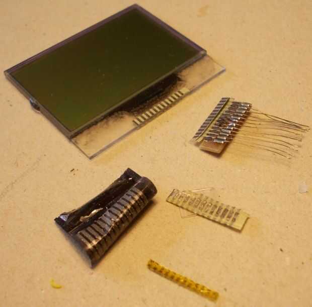 CONCLUSIÓN: en mi caso en particular a que la sección dañada del cable cinta era muy próxima las LCD las almohadillas de contacto, así que no había ninguna posibilidad real de lo reparen por cualquier método que describen antes. ¿La restricción de clave concluida fue: Cómo estabilizar los cables contra las almohadillas de LCD? La imagen muestra la basura que dejó la batalla.