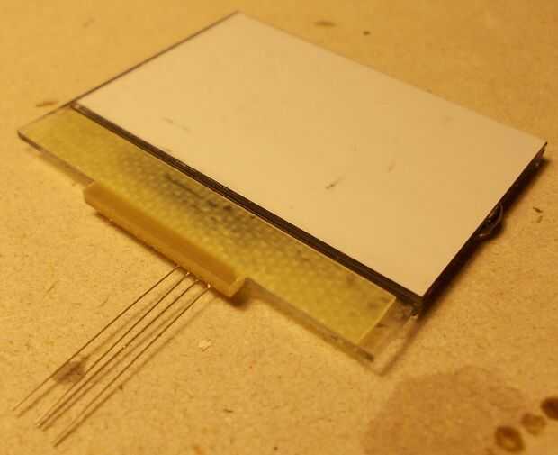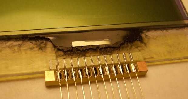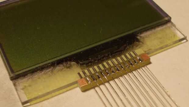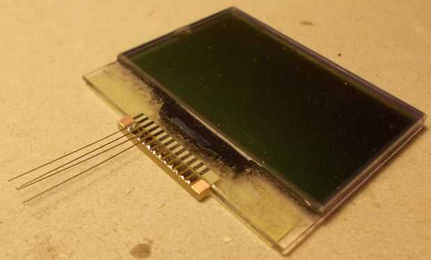Tomar un segmento de alambre con un clip, alinee con la línea central de la pantalla LCD y las almohadillas de PCB luego la soldadura hasta el PCB. Asegúrese de que cada extremo del cable esté alineado con el borde superior de cada almohadilla de LCD también.