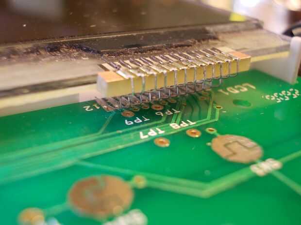 Hay un espacio muy estrecho entre el LCD y borde inferior de la luminaria y los botones de goma NXT. Probablemente ésta era la causa el cable de cinta no pudo con el tiempo (incluso con el ladrillo apoyado sobre un estante, el cable de cinta estaba doblado demasiado apretado en esa área y finalmente dio para arriba).