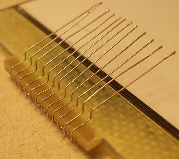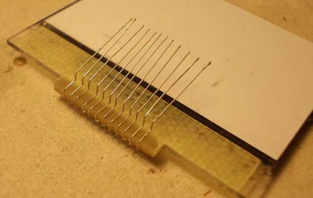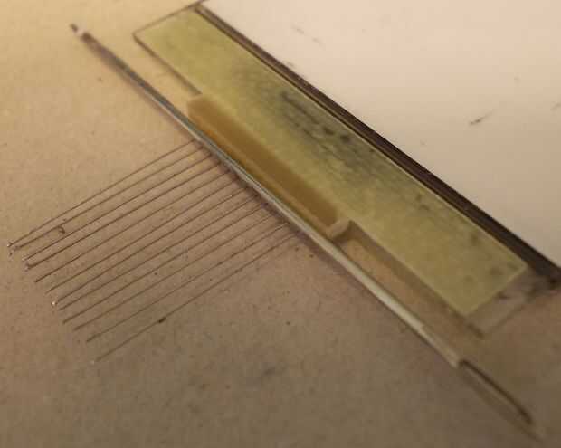 - Después de esto que necesita para doblar los alambres hasta 90 grados como los closeups muestra. Dejar alrededor de 2mm desde el borde de la lámpara use un clip o presione la aguja firmemente sobre los cables luego doblarlas hacia arriba. Estas curvas forman un pasito que así los botones de goma pueden caber en esa zona sin tocar los cables.