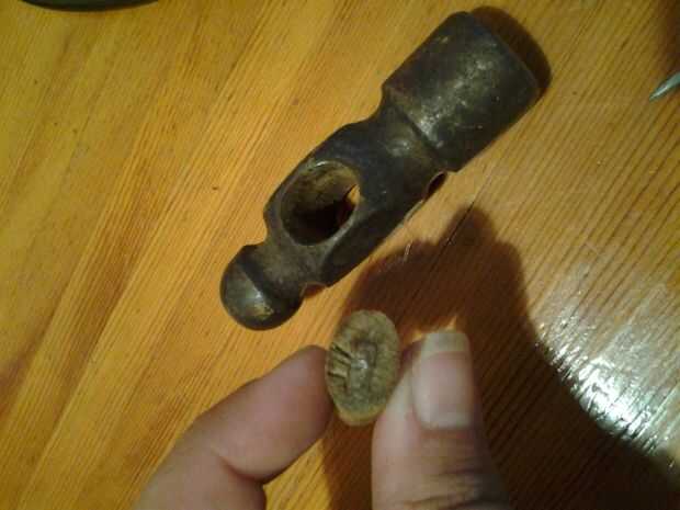 Primer paso es quitar la pieza rota de madera del ojo. Coloqué la cabeza del martillo roto sobre un agujero en mi yunque (cabeza de martillo del trineo) colocada un destornillador en el ojo y golpeado ligeramente hacia fuera. No tirarla tenemos la cuña y usar como una guía para corte por el eje del.