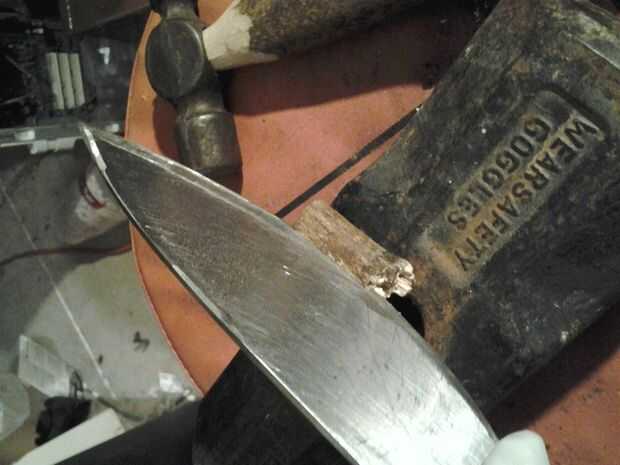 Ahora toma la pieza del ojo y dividirlo para quitar la cuña. Utilicé mi it todo cuchillo para dividir la hoja en la madera y golpeando la parte posterior con un martillo. Una vez que han liberado la cuña, línea y golpéelo para garantizar la cabeza. Ahora mi martillo gratis es fijo y sigue libre. ¡ Hurra!