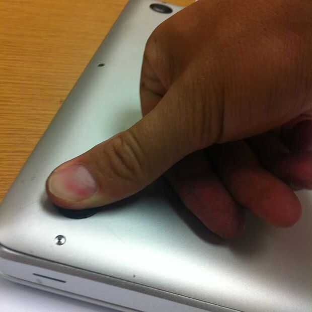 un chico en el hackerspace perdió algunos de los pequeños pies de goma que mantienen la distancia entre su portátil y el escritorio para permitir un enfriamiento eficaz. Él utilizó Sugru rojo de crear otros nuevos que pegadas en el lugar adecuado y g