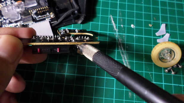 Mientras que derrite con cuidado saque el microinterruptor de pcb usando x-OTCA/pluma cuchillo o cualquier cosa que fina lo suficiente como para tirar de él. Desoldar todas las piernas hasta que pudo quitar el interruptor.