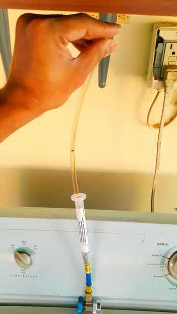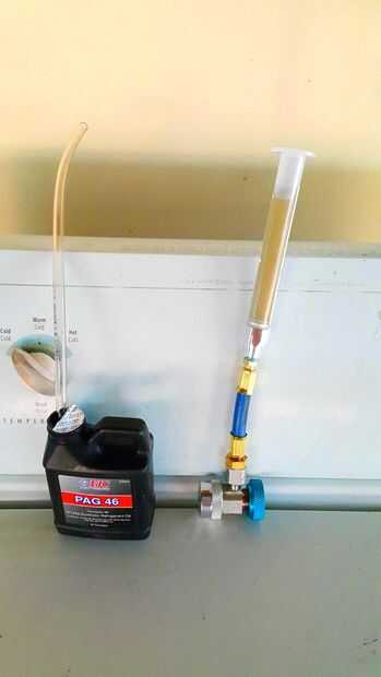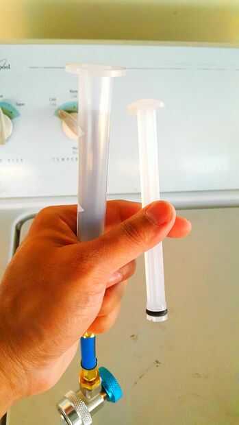 Una vez que la jeringa estaba lleno "movido" el émbolo para quitar burbujas de aire. Esta es la instrucción exacta por Robinair que dejó mis cejas torcidas para tal término irrisorio por una empresa de renombre. De todos modos, trabajó para sacar las burbujas.