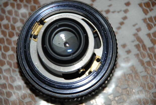 Podría retirarse el vidrio que cubre el diafragma (hacia la izquierda con un destornillador plano pequeño en una de las ranuras del Monte negro) y tocarlo e incluso de aceite (no. Debo limpiarlo después de eso. No aceite de una lente. Nunca).