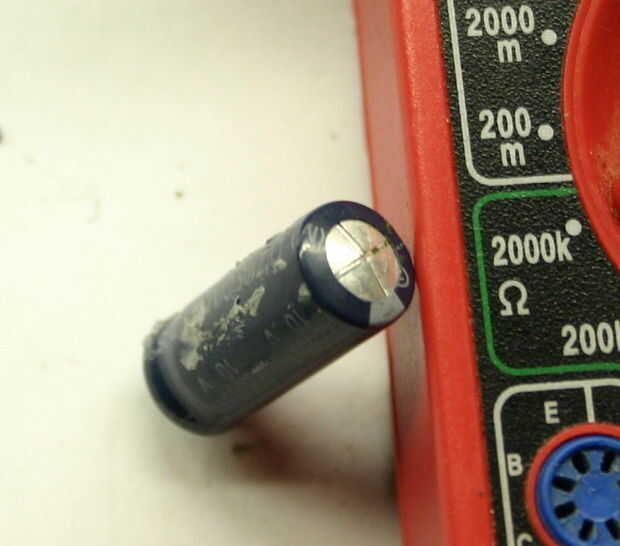 Básicamente, encontrar buscando las 'embarazadas' (o quemada por unos) y sustituirlos. No es tan fácil como parece, porque necesitarás una plancha muy caliente para calentar los puntos de soldadura en eso tablero de adaptador de red, y tienes un montón de pequeños SMC (componentes de montaje superficial) a mirar hacia fuera para cuando haces el trabajo. Aquí están algunas fotos de mi pesadilla de condensador; y un ejemplo de un condensador malo.