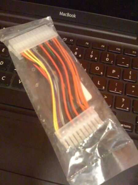 Tomar el cable de alimentación desde el iMac y hack de para que tengas unos largos cables y el enchufe de la fuente de alimentación de iMac que va a la placa madre dentro de la iMac.