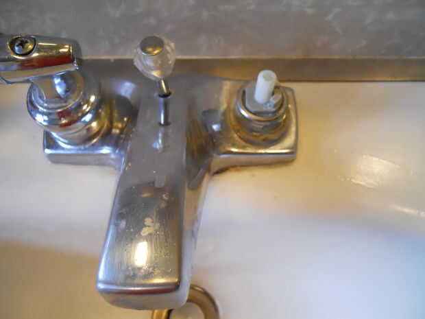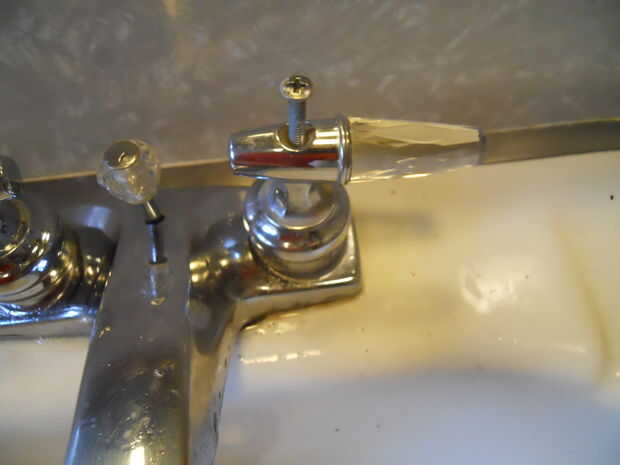 A continuación, afloje los tornillos en la parte superior las manijas. Muchos lavabos tienen versalitas en la parte superior el botón ocultar los tornillos. Si este es el caso, retire suavemente las tapas para exponer los tornillos.