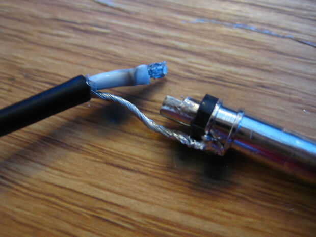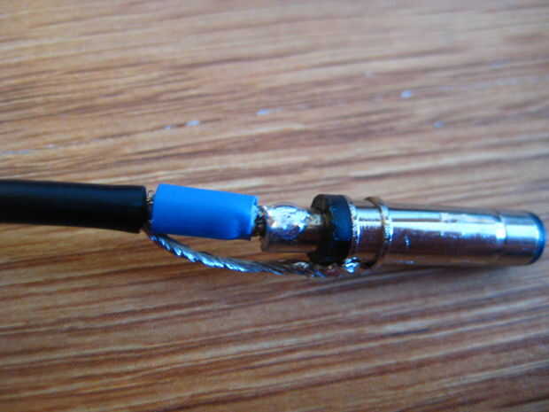 Deslice la tubería nueva en el cable y les de la soldadura. Mi enchufe el alambre medio fue para el conector del medio, y el cable exterior fue a la parte exterior de la clavija.