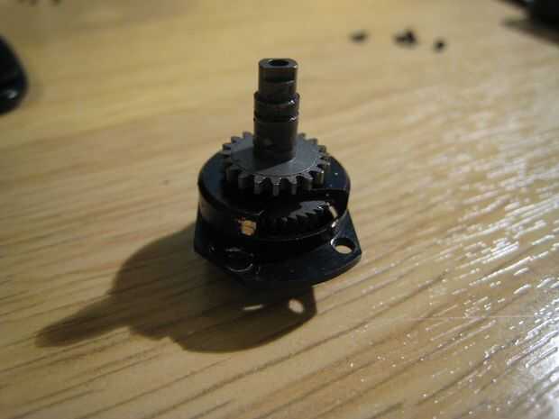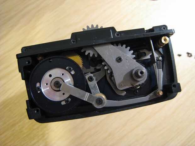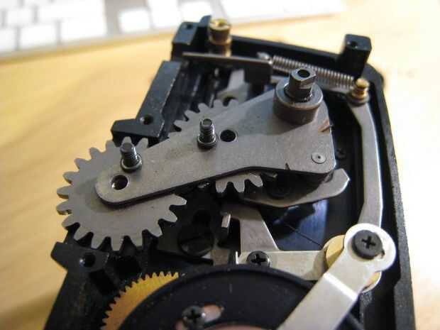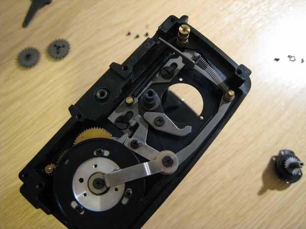Esto revelará el tren de engranajes para el transporte de la película. Quitar los dos engranajes de acero (Foto 5) y esto le dará acceso a la unidad de la bobina de recogida (foto 6). Hay tres tornillos que sujetan la unidad en su lugar (foto 7). Quitar estos tornillos y retraiga la unidad.
