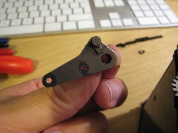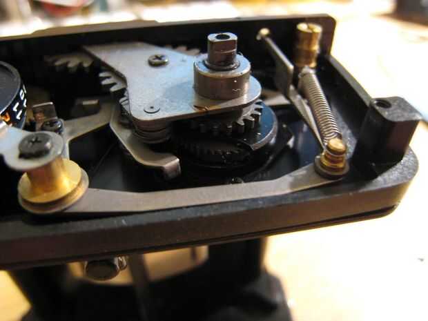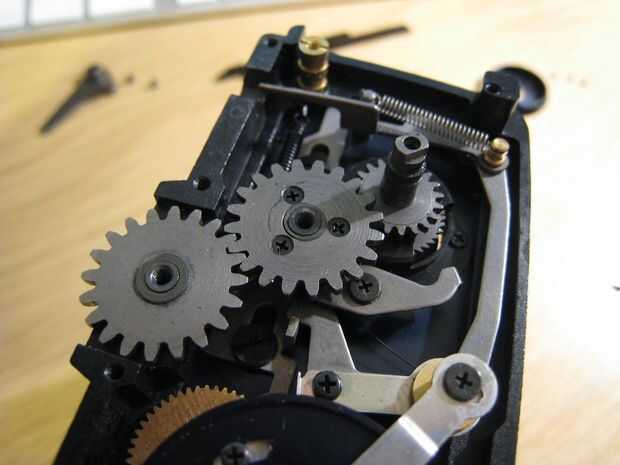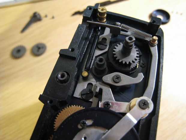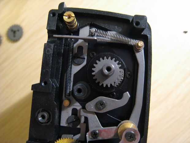 Para ello, primero retire la pieza de plástico que recorre el borde posterior de la inserción. Cuatro tornillos que sujetan (Foto 2). Luego remueva los 2 tornillos (Foto 3) que están sosteniendo el trinquete unidireccional para el avance de la película, luego retire la rueda dentada también (foto 4).