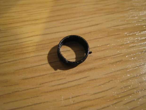 Sólo puedo suponer que el exceso de carga causado por el atasco de la película resultó en el resorte que es tirado a través de la muesca y causado la curva al ser eliminado en el proceso. El extremo suelto de la primavera se procedió a girar dentro de la vivienda escopleando con gubia el más suave de latón como fue, haciendo que todas las virutas de latón.