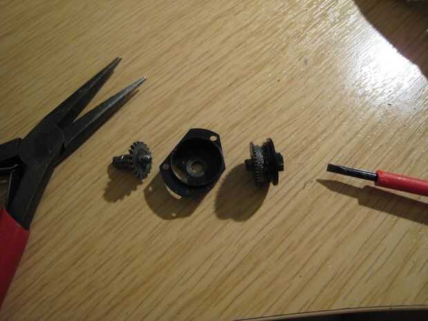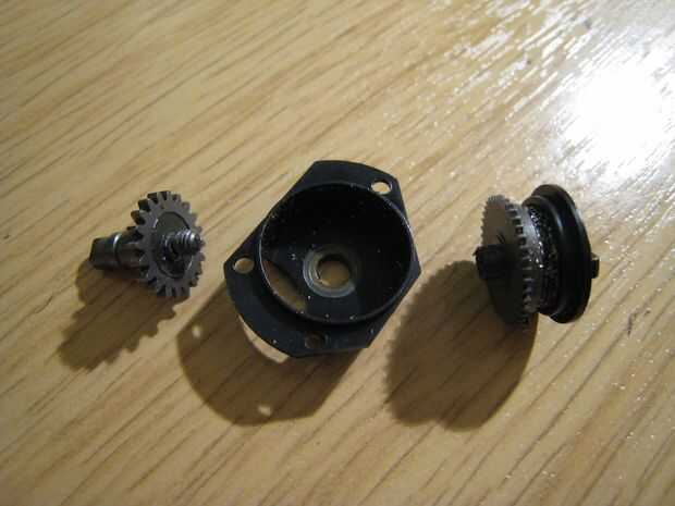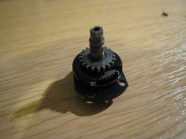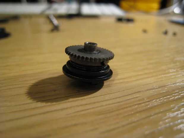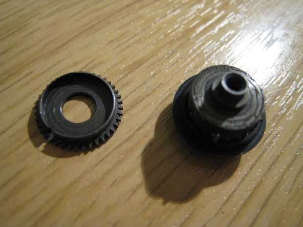 Básicamente el mecanismo es una forma de metal que sostiene un fuerte resorte cilíndrico, con un tapón reductor y una tapa inferior que engancha el carrete toman directamente. Bajo uso normal, girando la parte superior dará como resultado la parte inferior girando también. La primavera parece que realizan la función de tampón de carga de choque en el tren de engranajes.