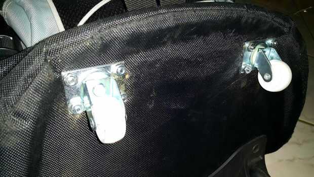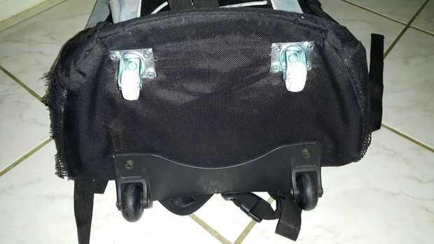 Con las dos ruedas instaladas la bolsa ahora puede rodar otra vez! No está mal para un trabajo de 30 minutos!
