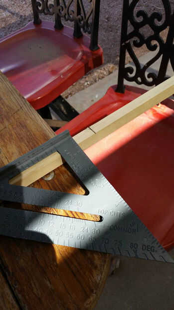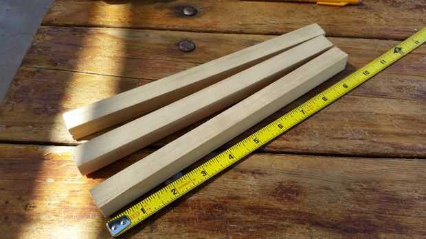 Conseguimos un pedazo de 3/4" espiga cuadrada de Ace Hardware. Utilizando una cinta métrica, marcamos la longitud del primer separador. Luego utilizamos una plaza para hacer una línea recta. Por último, utilizamos una sierra de mano para cortar el primer separador a longitud. Repetimos este proceso para los otros dos esparcidores.