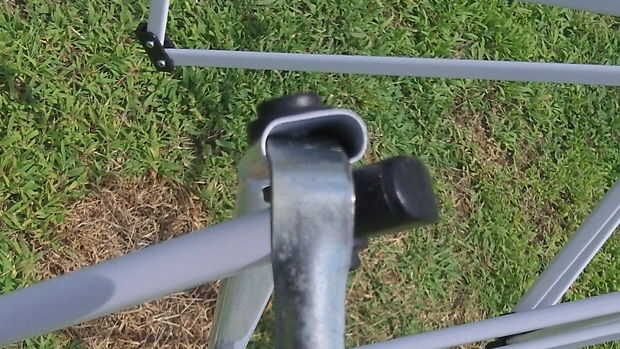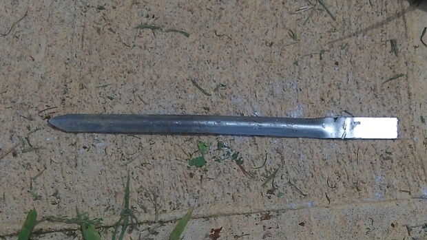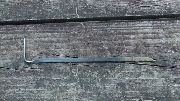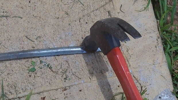 Martillado en hacia fuera de la tutela de la estaca para hacerlo recto (relativamente) por lo que puedo insertar en el polo. He dejado a lo largo de la curva en el juego para darle el poste reforzado algunos añade fuerza.