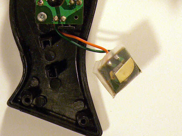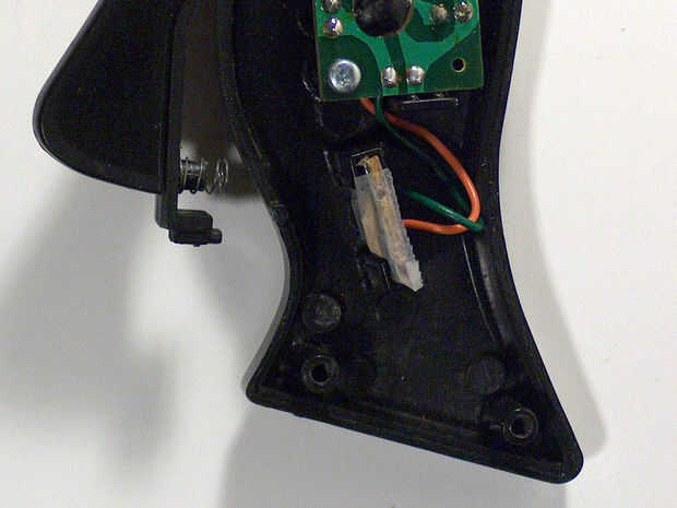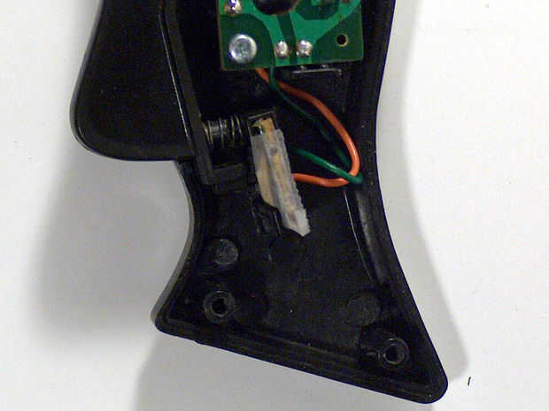 Resulta que el plástico gatillo no golpea el interruptor lo suficiente. Pensé en pegar una pequeña pieza de plástico al final del gatillo para extenderlo pero eso sería bastante complicado puesto que tuvo que encajar en un espacio muy pequeño. Entonces reconocí que todo lo que necesitaba era algún tipo de espaciador entre el disparador y el interruptor. No pude encontrar una pieza de plástico que cabría pero entonces pulsó inspiración – ¿por qué un trozo de cartón cortado a la medida?