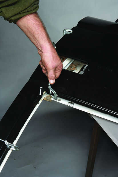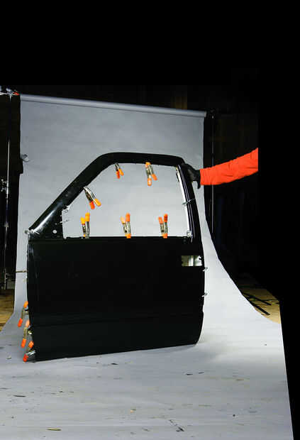 Utilice abrazaderas de resorte o pequeñas abrazaderas en C--muchos de ellos--a mantener la piel en su lugar como el adhesivo se seque. Asegúrese de que todas las partes de la piel hacen contacto con el marco. Limpie el exceso de adhesivo con una toalla de papel. Deje que el adhesivo endurezca durante 2 a 3 horas. Luego, después de retirar las abrazaderas, lugar un pedazo de viejo pero limpio la alfombra en su mesa de trabajo y coloque la puerta sobre él con la piel hacia abajo. Busque otra vez exceso de pegamento y arena o moler apagado. Luego, usando un martillo de bodyworking, empiece en una esquina de la piel y todo el camino alrededor del perímetro de la puerta, agacharse las lengüetas a lo largo de su longitud hasta que queden planos contra el marco. Tomar este último paso lentamente. Recorrer cada costura varias veces para apretar completamente el metal sobre la. No abollar el exterior de su nueva piel de la puerta.