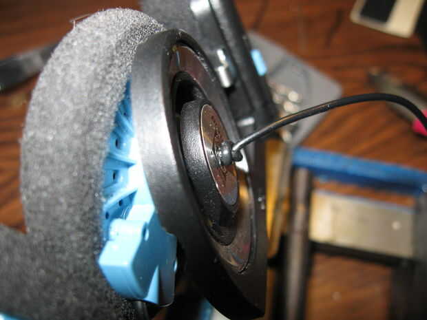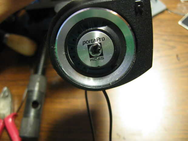 tenía un viejo par de altavoces de un ordenador corriendo windows 98 (así se puede saber a qué edad) que decidí hacer en auriculares.La diadema está hecha de pedazos de metal he encontrado en una impresora desmontadas.La pieza de la diadema al altavo