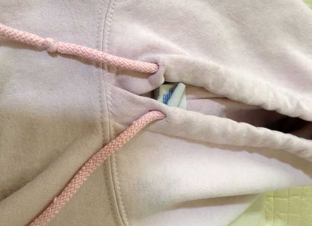 Desatar la cuerda (o córtela con cuidado) y listo. Felicitaciones por su sudadera con capucha es restaurado :)