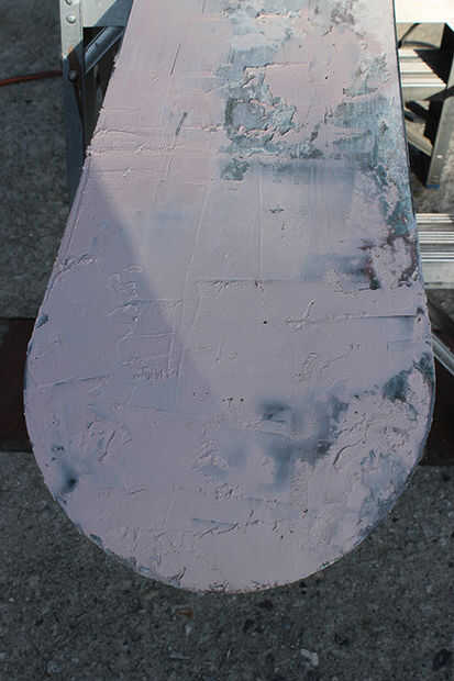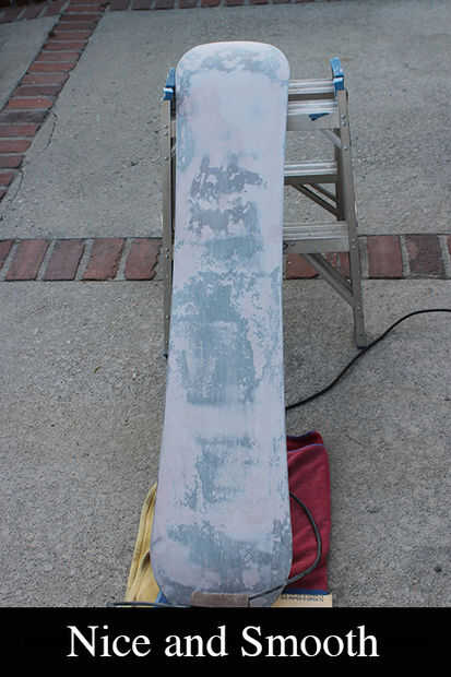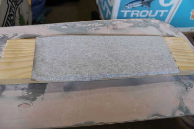 Ahora empezar a lijar. Hacer un bloque de lijado con papel de grano arena 50 (ver imagen) que es más ancha que la Junta Directiva y ejecutar hacia delante y hacia atrás hasta que se puede ver claramente el metal los bordes otra vez. Si usted golpea los bordes de metal que hace todo entre ellos no superior a los bordes de la Junta, esto es lo que quieres. También se puede utilizar una lijadora de Palma si es necesario, yo lo hice. Para ello todo el tablero hasta que se sienta como si fuera plana.