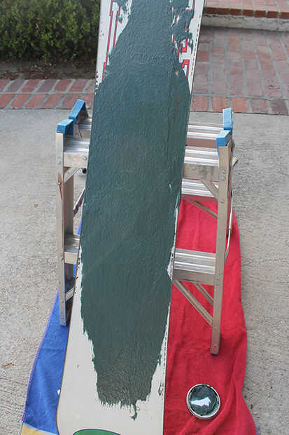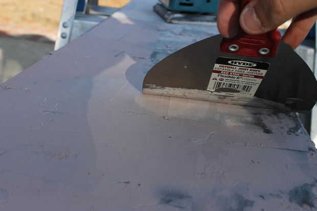 Está bien, así que mezclar el Bondo de pelo corto y repartidos en el área empotrada de la placa. Tomé entonces un trozo de madera que era más ancha que la Junta y utilizado como una herramienta para nivelar el relleno. Asegurado que el relleno quede a la altura correcta de los bordes de metal. Continúe haciendo esto hasta cubre todo el tablero en la parte inferior. Asegúrese de que el relleno de la mezcla cuidadosamente y con suficiente endurecedor, si no lo hace quedará pegajosa. Lo tuve a suceder en una sección y acabó cortando hacia fuera y poner nuevo relleno en.