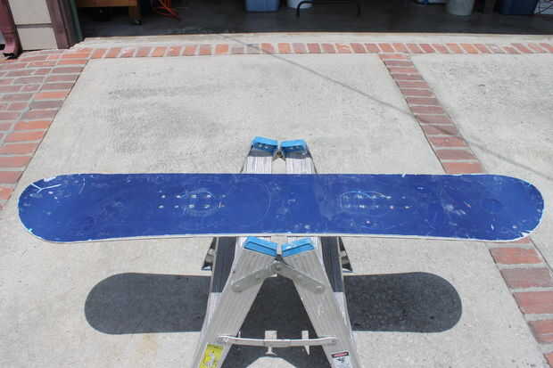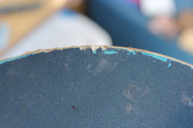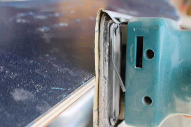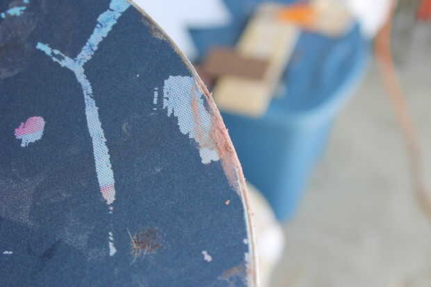 Finalmente llegué a la parte superior con un papel de lija de 50 grano en mi lijadora de palma para sacar la superficie de la pintura azul así como cualquiera del adhesivo de las etiquetas engomadas. Entonces usé grano 100, seguido por papel de lija grano 150 para suavizar la parte superior. Sólo queremos áspero para arriba, no de sobrecortes demasiado profundo.