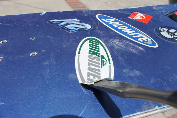Si tu tablero es como el mío y tiene pegatinas, un simple cincel o un destornillador de cabeza plana se pela derecha. La mayoría se desprenda fácilmente porque se unen a la fibra de vidrio, no de un material más poroso. (Ver imagen)