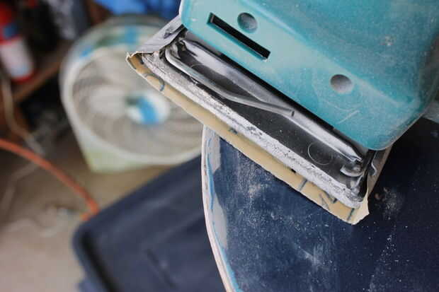 Luego tuve algunos golpes en la pieza superior de fibra de vidrio que se fijaban fácilmente por trozos en algunos Bondo. No dude en ponerlo en espesor, será arena fuera bastante fácilmente. Tomé mi lijadora de Palma y utiliza los bordes de la Junta para hacer la forma correcta al lijar (ver imagen).