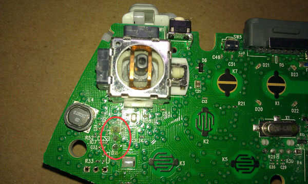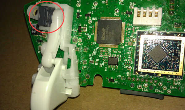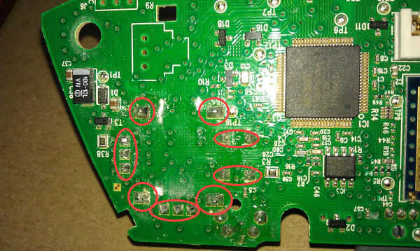 Vuelta a la placa de circuito y ubique los pernos de la palanca de mando y el interruptor. Son post 4 pines, 2 sets de 3 pernos para potenciómetros y 4 pins para el interruptor, como se muestra en un círculo en rojo en la tercera imagen.