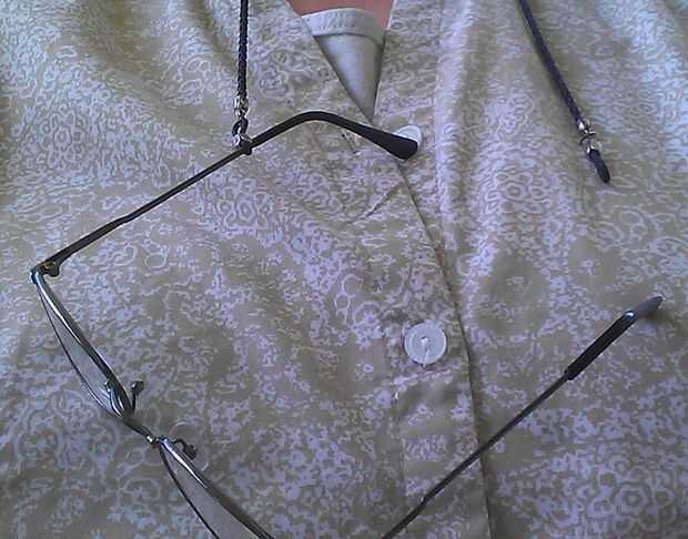 La solución estaría todavía trabajando... pero finalmente había aplastado las gafas y rompió una oreja mientras que lleva una sandía pesada la semana pasada. (Otra vez Arrgh! Durante los próximos días los eyeglasses constantemente deslizaron su cordón otra vez, varias veces al día. Había olvidado cuánto de una molestia que podría ser. )