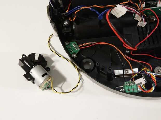 Una vez retirada la placa principal, usted verá el motor del cepillo lateral delante de la rueda derecha de Bob.