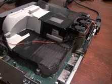 Cuando vino a mantener fresco el gpu decidí hacer algo diferente. He buscado durante horas tratando de encontrar a alguien quien extendió la cubierta de refrigeración con ventiladores; crear una entrada de aire frío. Así que compré dos mini ventiladores de shack de radio y construyó una cubierta de front-end de cartón y pegamento caliente. Tuvo un par de horas porque era muy complicado y debe de ser la forma perfecta y alrededor de todos los componentes existentes. Salió perfecto y empujó mucho aire sobre el disipador de la gpu, en sus el propios. Una vez conectado al ventilador posterior se creó un gran flujo de aire sobre el disipador de calor y mantiene muy fresco; uno tira aire frío en y el otro empujando hacia la parte posterior. También hice el modd de 12 voltios con dos 150 ohm resistencias corrieron en paralelo.