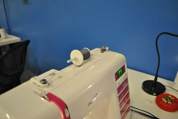 Para la máquina en TechShop, yo simplemente alineados mi hilo según el diagrama en la parte superior y mi bobina en la barra de la máquina. Entonces sostenga el pedal hasta que la bobina se llena para arriba.